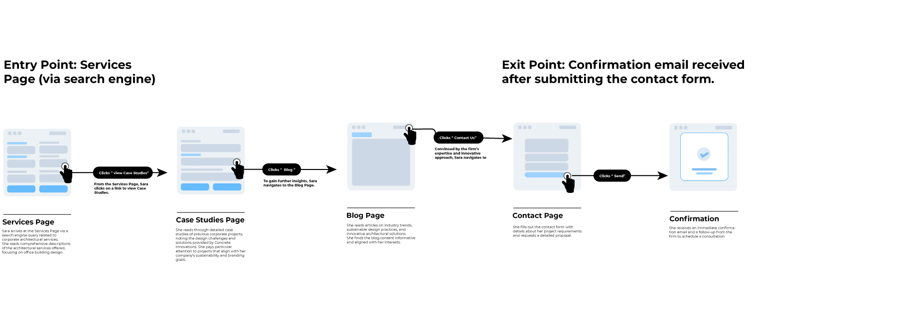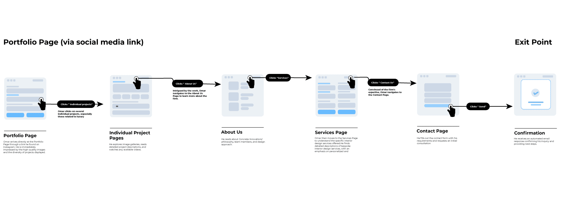By mapping these user flows, Concrete Innovations can ensure that each persona has a tailored and intuitive journey through the website, ultimately leading to increased engagement and conversion rates. Each flow highlights the key interactions and navigation paths that align with the specific needs and goals of the personas.